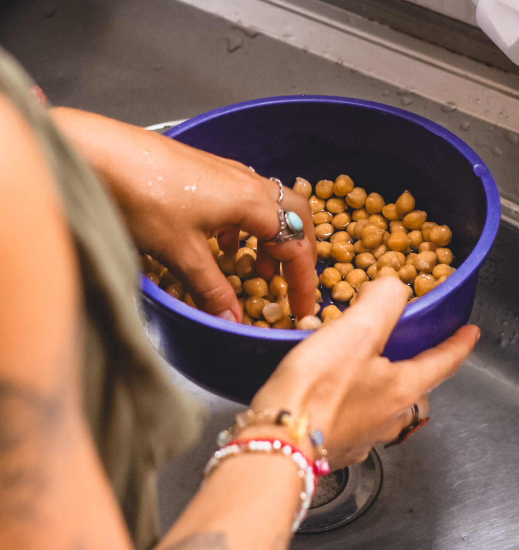Deixe o grão de bico de molho em água por, no mínimo, 12h e vá trocando a água sempre que possível. Esse processo é fundamental no preparo de todas as leguminosas para diminuir a quantidade de rafinose e estaquiose. Esses compostos são chamados antinutricionais, pois interferem na absorção de alguns nutrientes do alimento, como ferro e cálcio, e são os responsáveis pelos gases e sensação de estufamento quando comemos esse tipo de alimento.